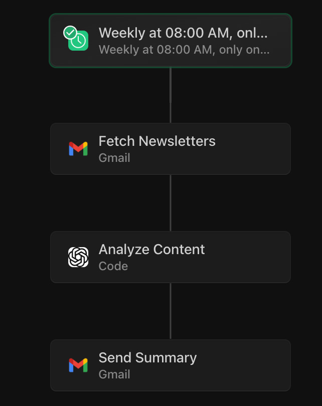 Gmail newsletters/content → Email summary of best AI related content ideas.